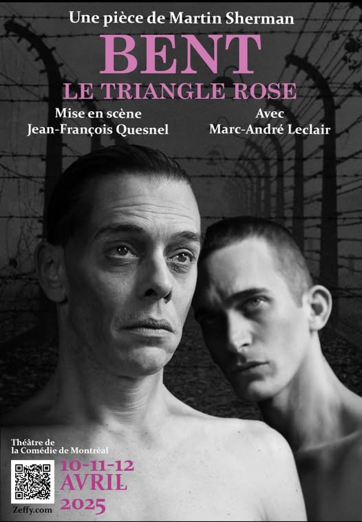 Fort du succès des pièces Hosanna et Tom à la ferme, le Collectif théâtral LGBTQ+ « ENSEMBLE » est fier de présenter l’œuvre de Martin Sherman : BENT, le triangle rose, mise en scène par Jean-François Quesnel. La pièce met en vedette Marc-André Leclair dans le rôle de Max. Le spectacle sera présenté les 10, 11 et 12 avril 2025 au théâtre La Comédie de Montréal, en plein cœur du Village gai. Le coût des billets se veut accessible et solidaire.