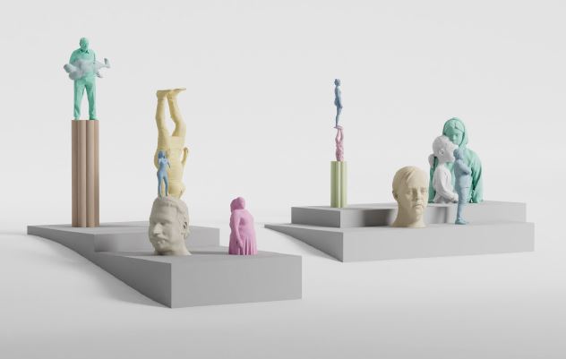 L’ensemble sculptural proposé par Frédéric Laforge se déploie sur les sites localisés à chacune des deux entrées principales. L’artiste y propose une série de personnages aux allures diverses dont le rendu réaliste est contrecarré par des formats invraisemblables et une palette chromatique douce. Parmi les protagonistes, certains sont en situation de handicap, d’autres sont âgés. L’on retrouve ainsi des sujets chers à Frédéric Laforge, rendus visibles grâce à son langage visuel empreint d’empathie, de bienveillance et d’humour. Il célèbre, comme l’évoque son titre, la diversité des capacités corporelles, propre à chacun-e dans un univers marqué par le jeu et les sports aquatiques.