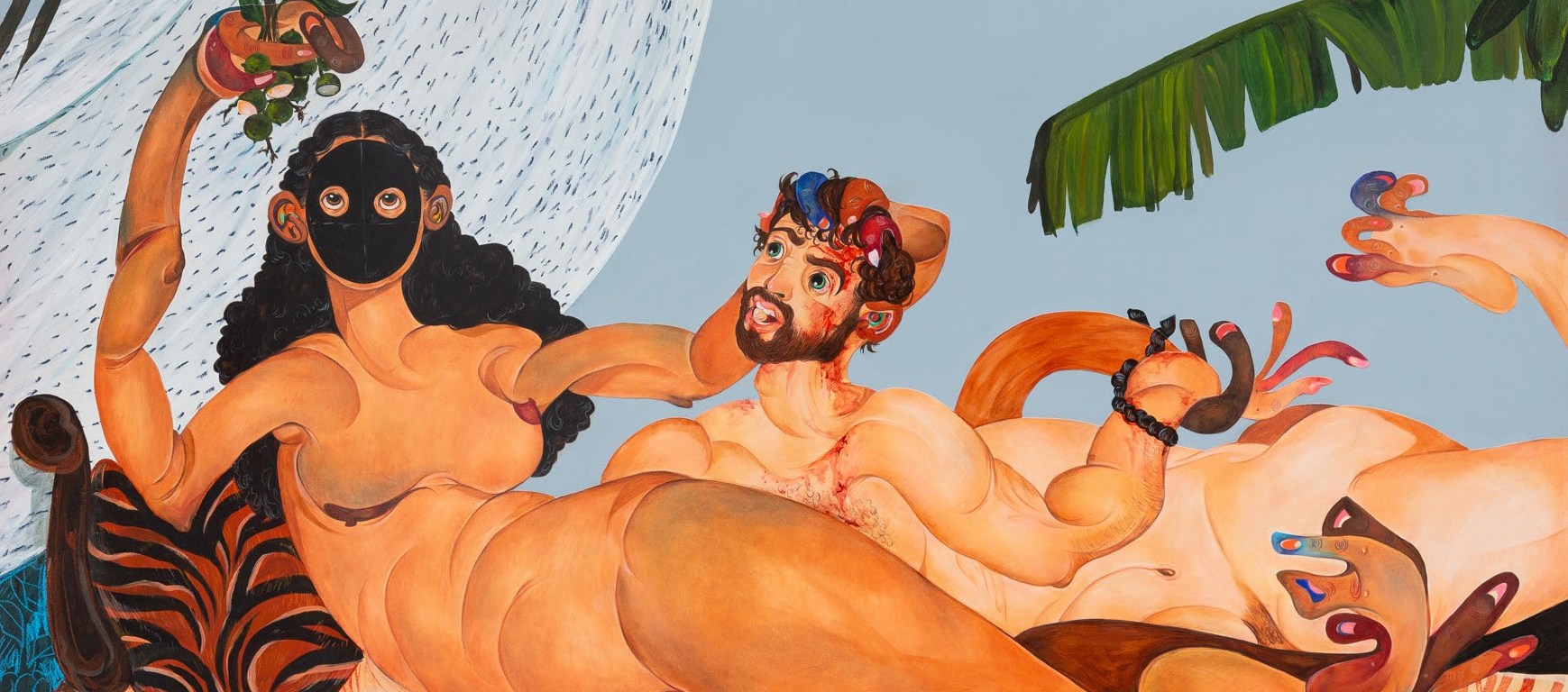 Né à Tenares (République dominicaine), Bony Ramirez vit et travaille actuellement à Jersey City (New Jersey). Ramirez imbrique dans sa pratique ses souvenirs d’enfance en République dominicaine, ses premières rencontres avec l’iconographie catholique ainsi que son intérêt profond pour les œuvres maniéristes italiennes, la portraiture de la Renaissance et les illustrations pour enfants. Si les personnages fictifs créés par Ramirez semblent être transposés dans un théâtre changeant d’environnement et des décors hauts en symbolisme, c’est la technique de l’artiste qui rend cela possible. Il crée ses êtres fortement stylisés et déformés sur papier en utilisant de la peinture, du pastel gras et des crayons de couleur, et les adhère par la suite sur des panneaux en bois. Ces personnages, ainsi que divers autres objets symboliques, sont superposés sur des arrière-plans idylliques et colorés tirés de l’imagerie des Caraïbes. Ramirez utilise une variété d’objets qui complètent l’aspect ludique et idyllique de son travail, comme des perles colorées, ou qui le contrastent en le transperçant de violence, comme des couteaux plantés dans la toile.