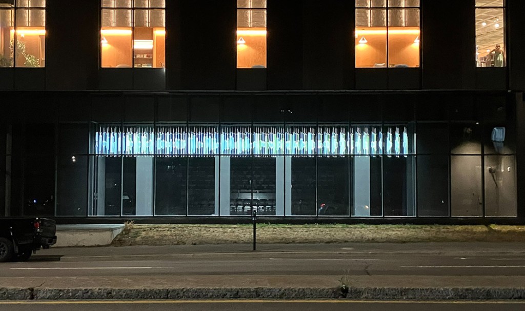 Ayant pignon sur rue depuis le boulevard René Lévesque Ouest et près du square Cabot, rappelons que l’œuvre d’Hannah Claus s’inspire des ondes sonores d’un chant de gorge chanté par les Inuuk, Nina Segolawitz et sa fille, Sierra Segolawitz-Clabaux. Tracées d’après leurs visualisations à l’ordinateur, ces ondes sonores s’allient autant aux contenus technologiques du laboratoire musical qui se trouve à l’intérieur du Centre Sanaaq, qu’aux activités socioculturelles et communautaires qui figurent dans la programmation du Centre, qu’à la salle de spectacle.