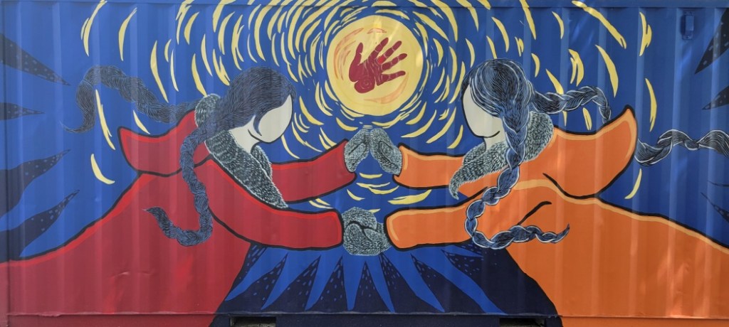 Conçue par l’artiste Jason Sikoak, la murale intitulée Ielles chantent se trouve à proximité du square Cabot, un lieu important pour les personnes autochtones en situation d’itinérance. L’œuvre a émergé d’un processus de cocréation avec les éducateurs et les éducatrices artistiques de MU et les employés du Café Maison ronde, un organisme d’insertion sociale soutenu par L’Itinéraire.