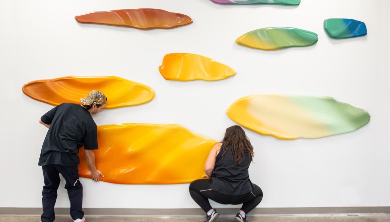 Réalisée par Laurent Le Bel-Roux et Florence Viau, Archipel se compose de 13 éléments ondulés représentant des flaques d’eau aux formes et aux couleurs uniques. L’assemblage de pièces colorées crée un paysage aquatique en perspective. À l’image du complexe aquatique de Rosemont qui regroupe plusieurs services et usages, chaque pièce de l’archipel est considérée comme une « île » possédant sa propre identité, tout en faisant partie d’un ensemble plus vaste.